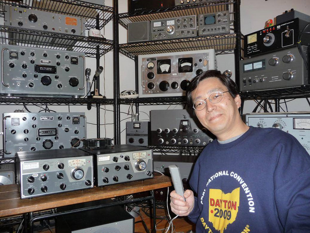 Masa sitting  next to two racks of radios. Each rack has four or five shelves loaded with cool equipment. You will have to ask Masa what it all is.